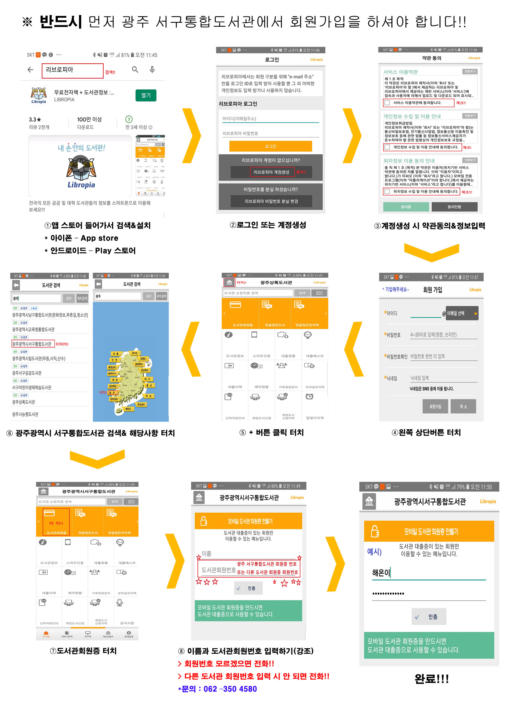 - 스마트폰을 이용하여 언제 어디서나 공공도서관의 다양한 서비스 이용할 수 있습니다.