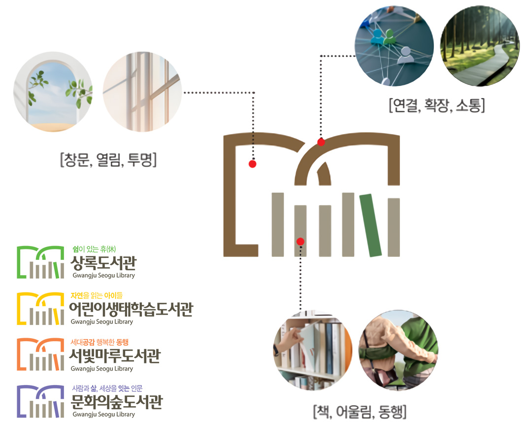 펼쳐진 책과 창의 형태를 모티브로 열린 공간의 의미를 함축하고 있는 디자인. 서가에 꼿혀있는 책을 통해 도서관브랜드의 이미지를 직관적으로 표현하였으며, 4개관의 특성과 테마를 고려해 컬러와 형태의 변화를 주어 포인트를 주었다